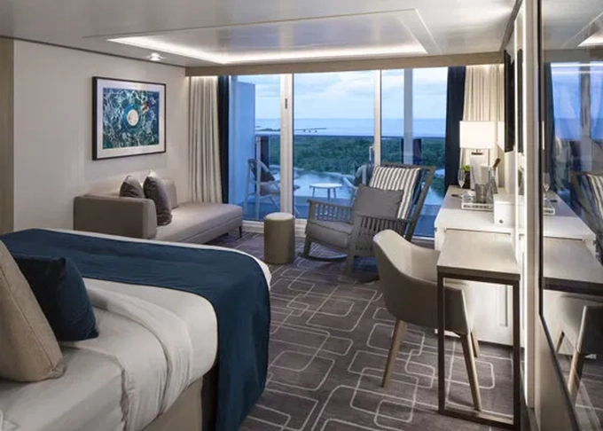 | IC - Iconic Suite 176 m² + terasa s vírivkou 64 m². 2 spálne, 2 kúpeľne (1 s vírivkou).12. paluba. Max 6 osôb. Výhody Retreat Suite + Icon Suite extra: Dizajn: Kelly Hoppen. Používanie fitness bicyklov Peloton® v kajute, In-suite Personal Retreat Host's komora, obliečky Celebrity eXhale™ s kašmírovým King matracom, elektronické ovládanie zariadení v miestnosti pomocou dotykovej obrazovky | 31 232 € 15 616 € za osobu |