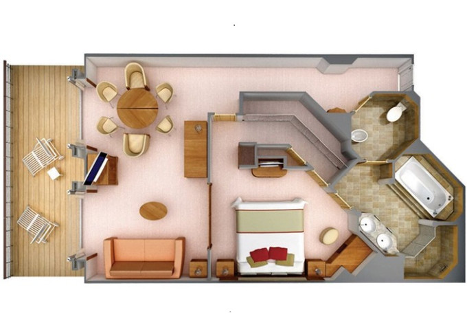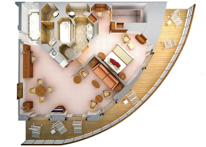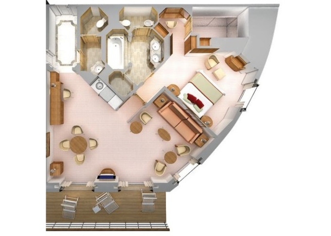 | R1 - Royal Suite 1 92 m² (vrátane balkóna 12 m²), Spálňa s obývacou a jedálenskou časťou. 7. paluba vpredu. Max 3 osoby. | 54 900 € 18 300 € za osobu | ||