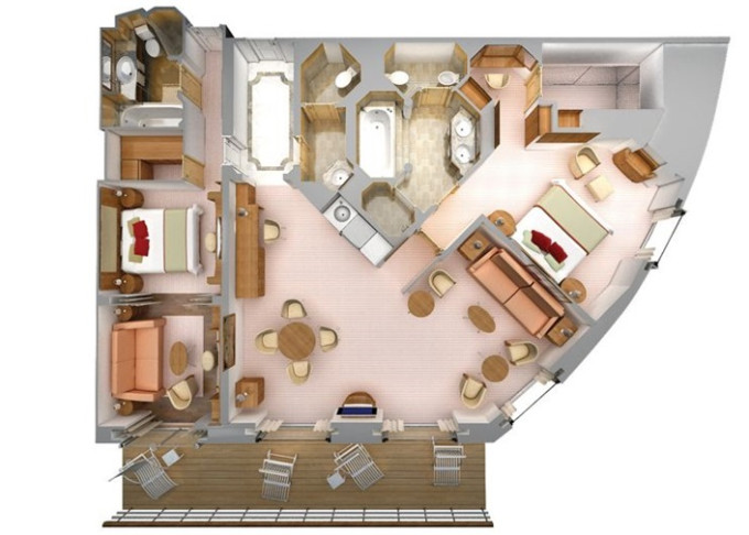 | R2 - Royal Suite 2 127 m² (vrátane 18 m² balkónov). Royal Suite prepojená s Veranda Suite. 7. paluba vpredu. Max 5 osôb. | 108 800 € 27 200 € za osobu | ||